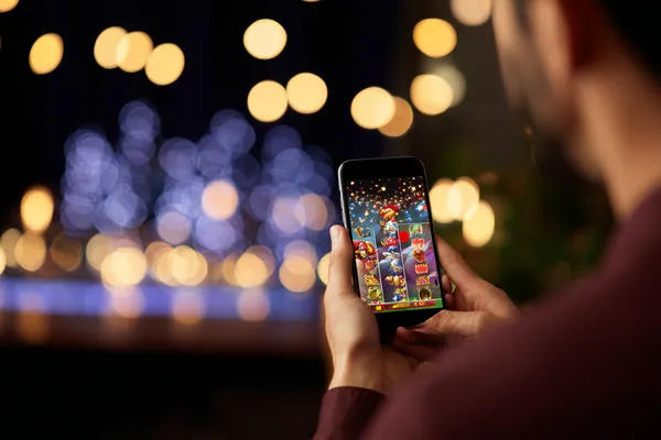 A player using their smartphone during a festive local event, representing OKPK’s fully mobile-friendly casino.